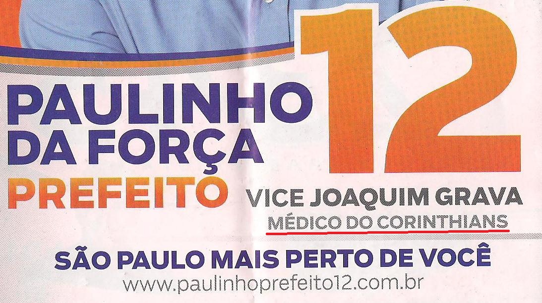 Confira abaixo um dos prospectos distribuídos pela dupla, em São Paulo, com o nome do “Corinthians” quase do mesmo tamanho que o do candidato.
