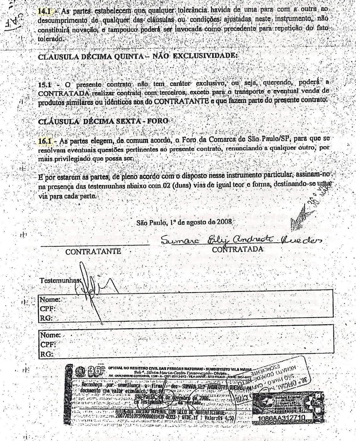 Na segunda versão, que a Transvima alega ser falsificada e não ter assinado, a data do contrato é anterior, 1 de agosto de 2008, contém a mesma assinatura, e foi autenticado, estranhamente, no mesmo dia da autenticação anterior.