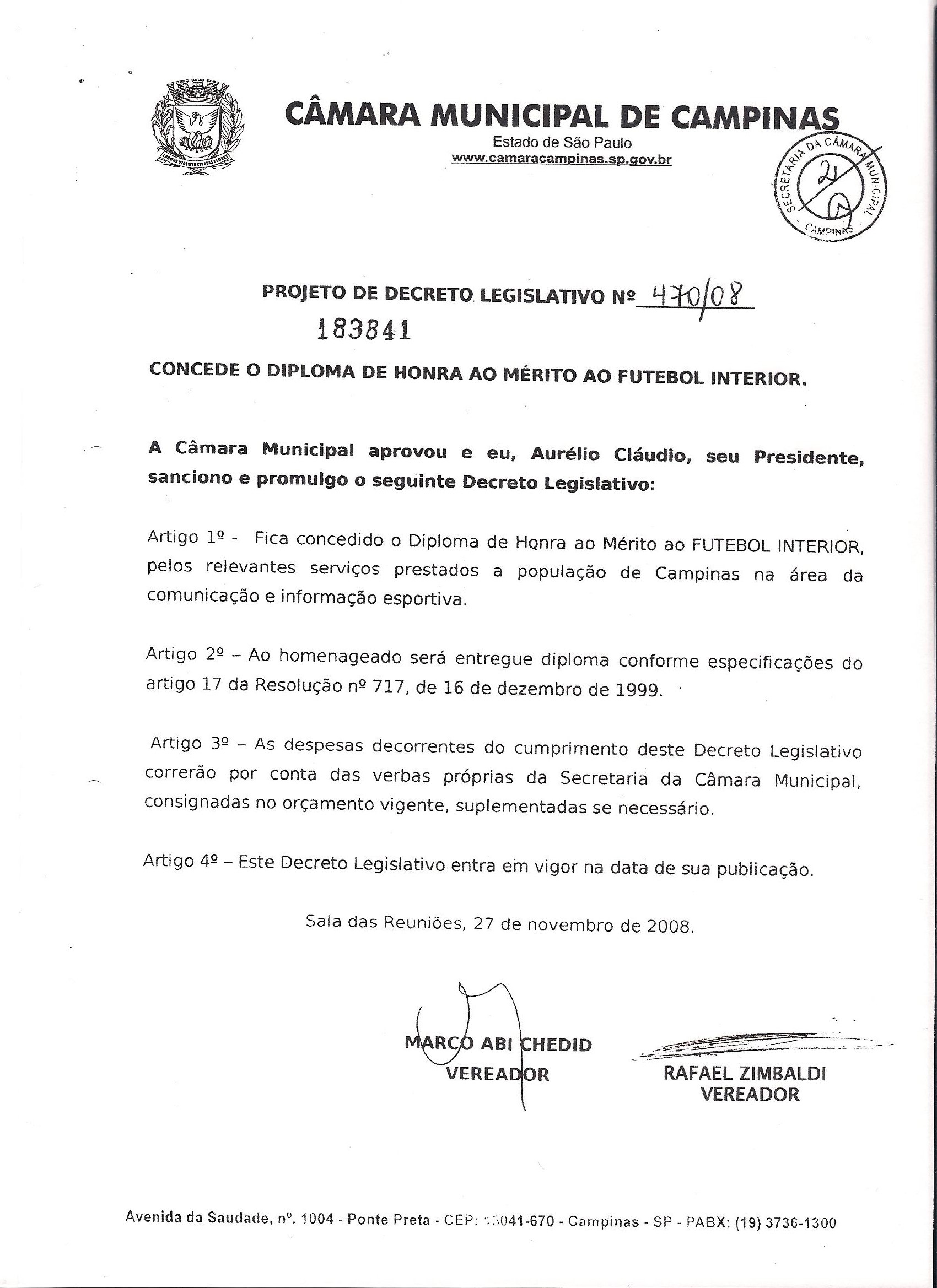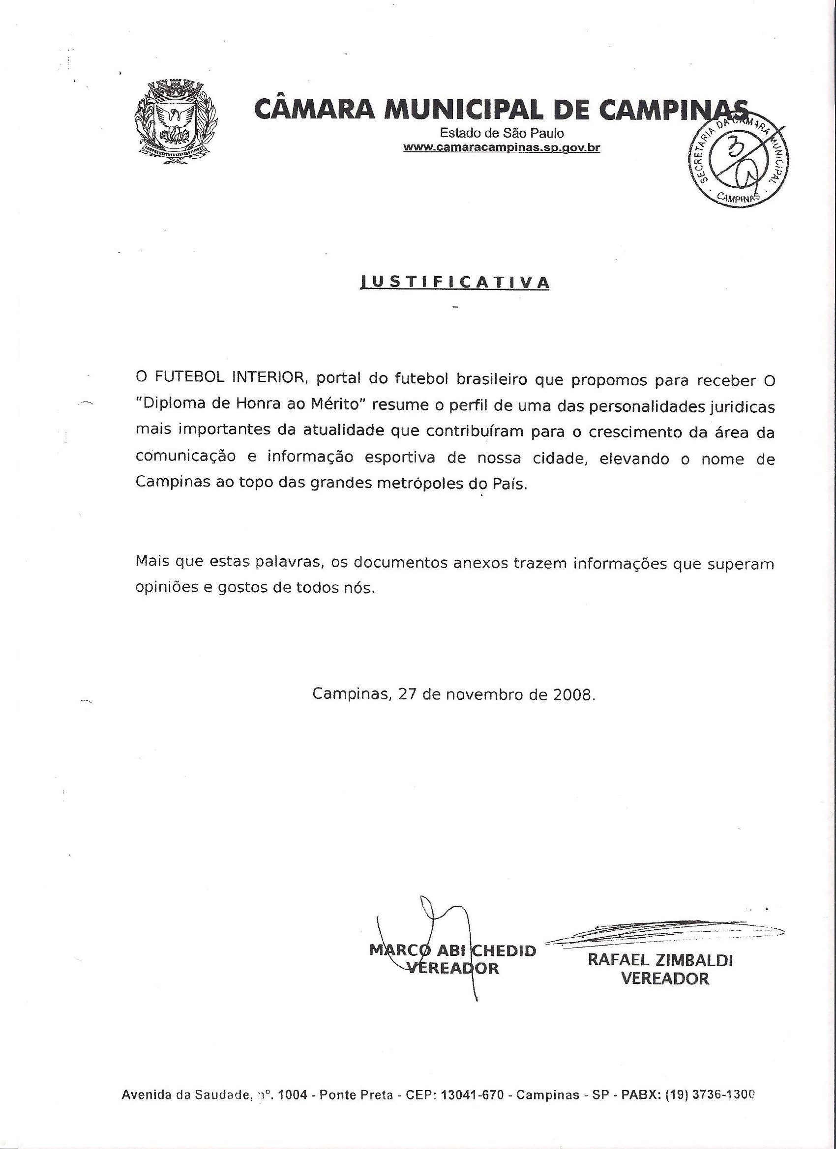 Em reunião realizada ontem, na Câmara Municipal de Campinas, após turno único de discussões, foi aprovado, em votação, a entrega do título de “Honra ao Mérito” para o site Futebol Interior, por “contribuição ao crescimento da Comunicação e informação esportiva na cidade.”